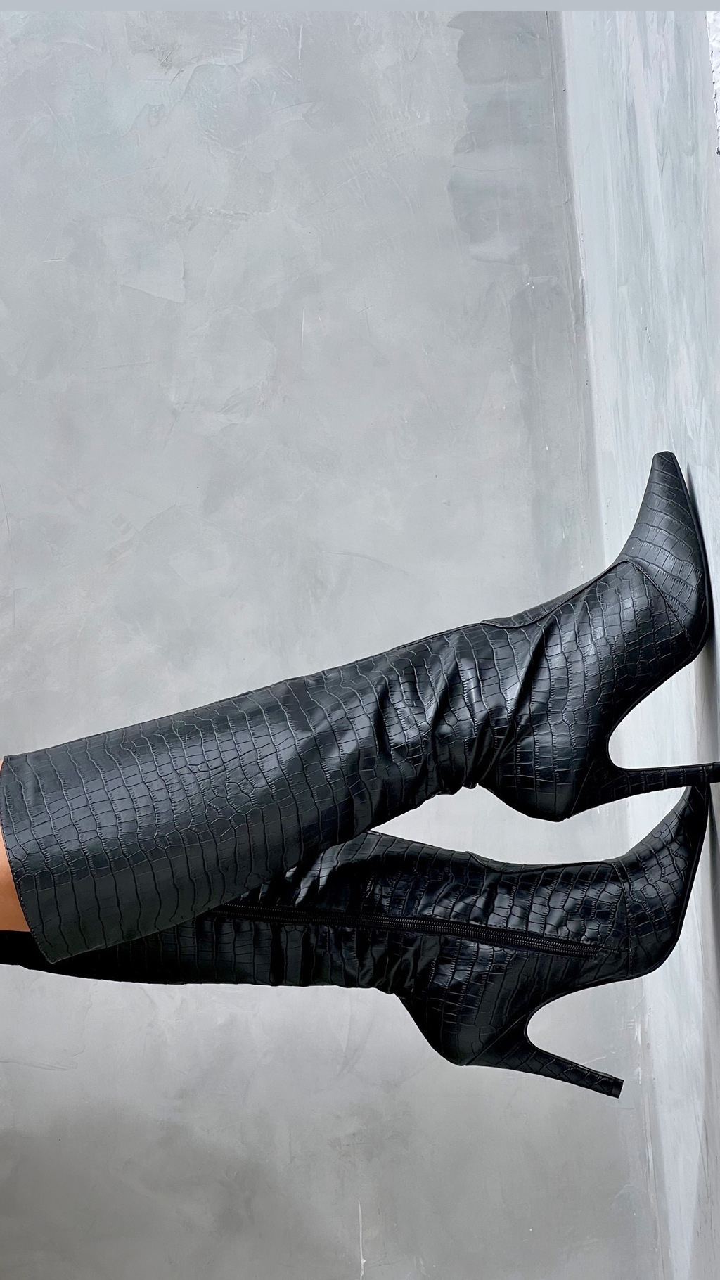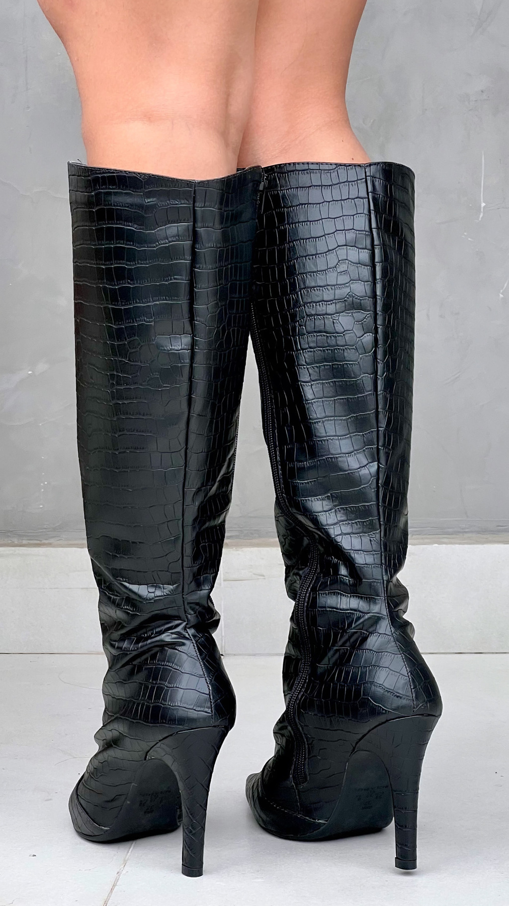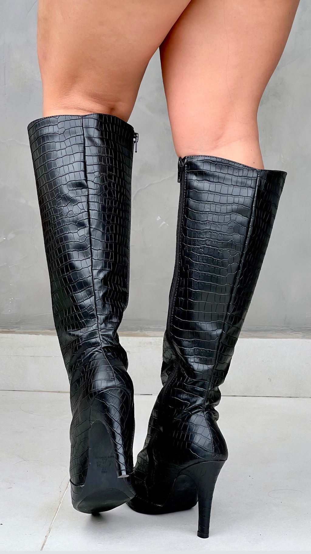 Salto: 10 cm de Altura e Revestido em Napa Croco na cor Preto;